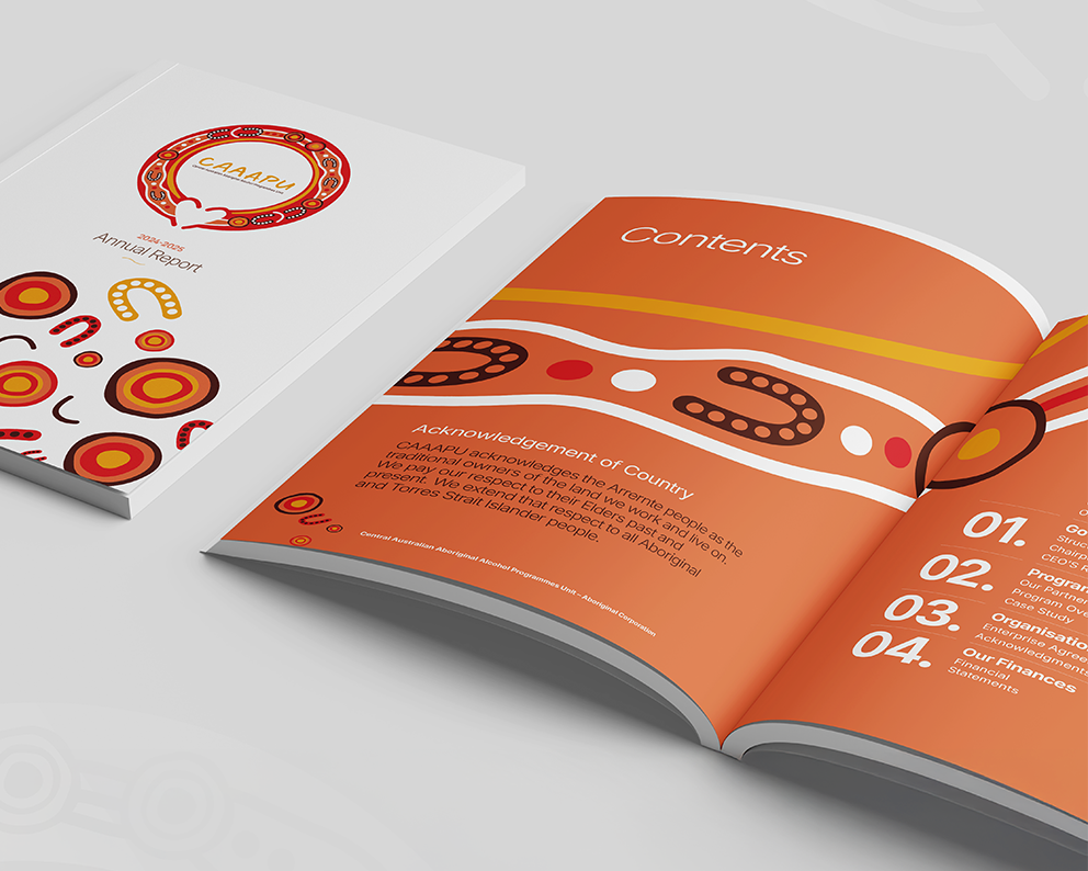 The Central Australian Aboriginal Alcohol Programmes Unit (CAAAPU) engaged bellette to help bring their newly developed brand to life across a major suite of communications. This included a 50-page annual report, as well as a full range of stationery and supporting collateral, each requiring careful application of the new visual identity.